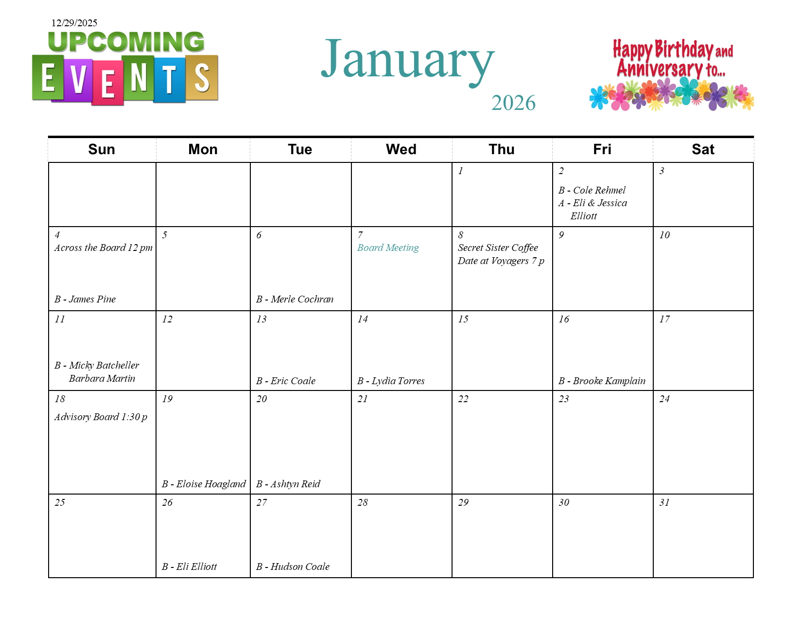 Click here to print calendar of birthdays and events